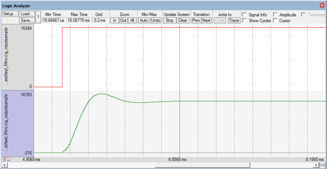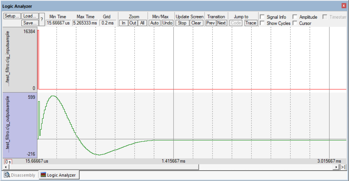 La simulación se detiene después de cada test. Ajusta el zoom y los valores Min/Max de la gráfica para visualizar correctamente la señal.